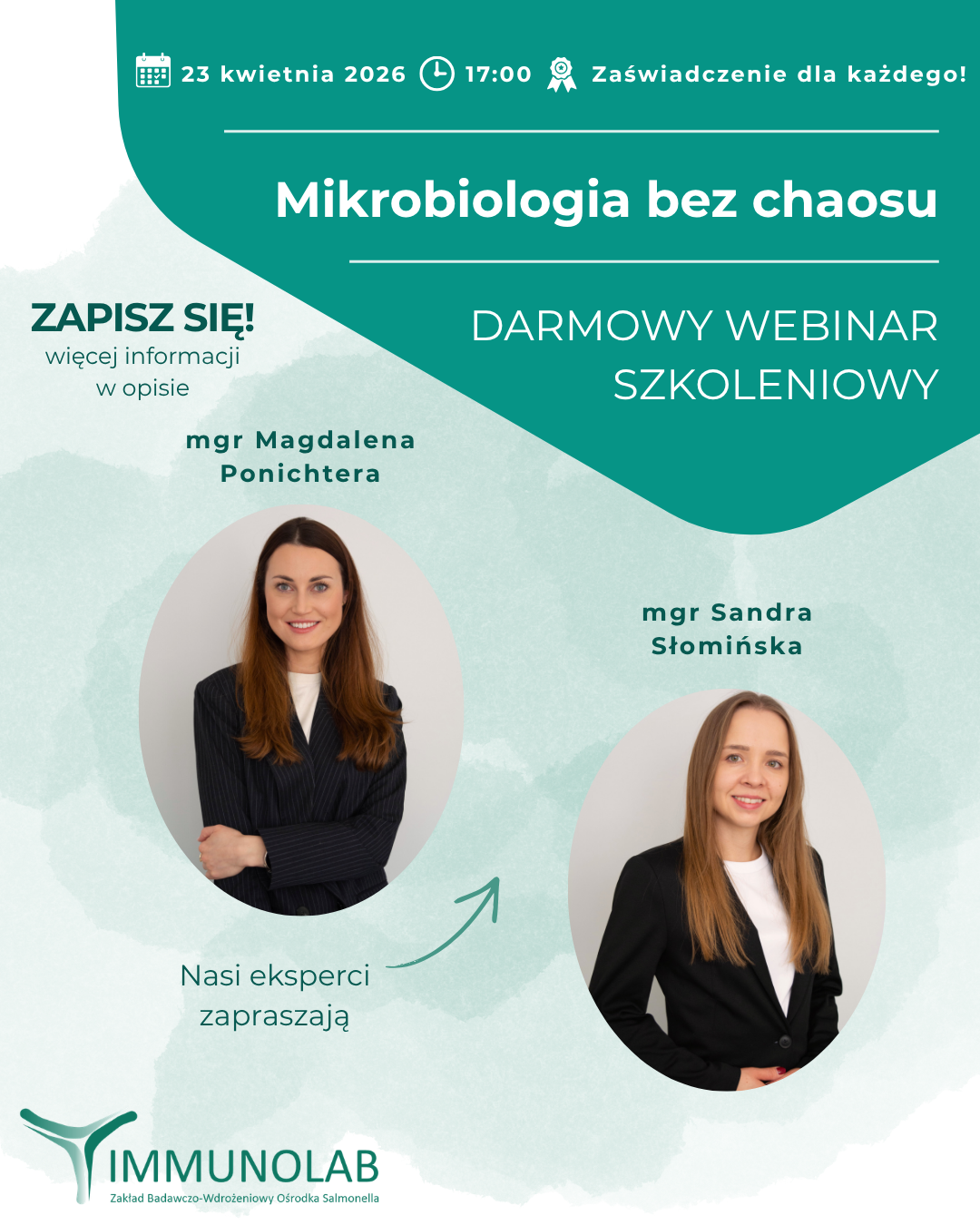 Zgłoszenia przyjmujemy mailowo – wyślij wiadomość na adres szkolenia@immunolab.com.pl → w tytule wpisz: „Darmowe szkolenie 23.04.2026”, w treści podaj imię i nazwisko do wystawienia zaświadczenia o uczestnictwie.